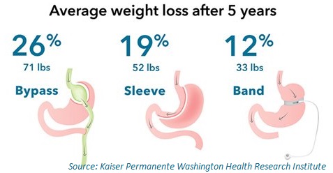 This study analyzed the outcomes for more than 65,000 patients for up to five years. Qualitatively, the numbers are not a big surprise. But the big news is that we have a good fix how to compare the real-world effectiveness of different bariatric procedures. Gastric bypass provides the most weight loss – on average. After five years, patients lost an average of 26 percent of their starting weight. Compare that to 19 percent for gastric sleeve patients.