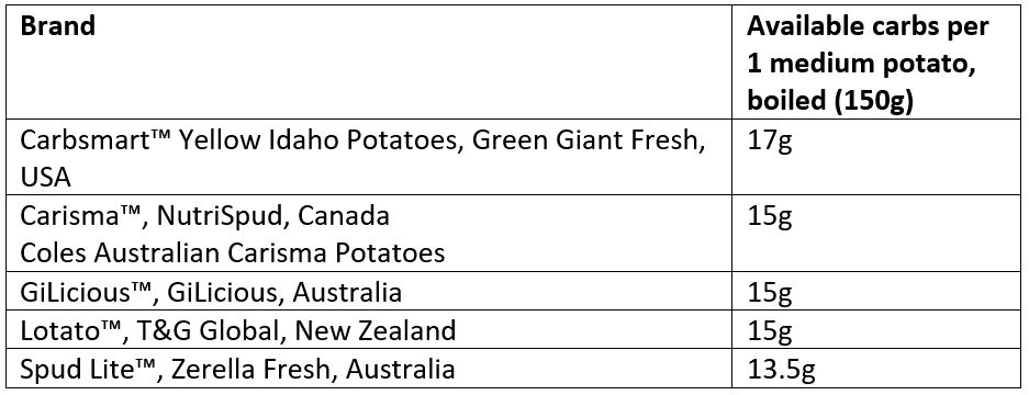 There are some varieties of potato with fewer carbs. We sourced five packaged brands with about 20–25% less carbohydrate than regular spuds. Because growing conditions affect the carb content, the producers test their spuds regularly to ensure they meet the lower carbs claim on the packaging.