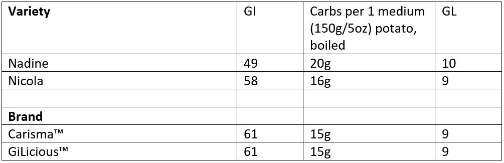 Potatoes are good carbs, but they are carb rich. A typical medium potato (150g/5oz) has around 20g carbohydrate. Most also have a high GI (averaging around 77). But there’s no need to say no to potatoes if you are managing blood glucose levels. You can reduce their glycemic load by choosing spuds with around 25% less carbs (Lotato™, Carisma™, Spud Lite™, GiLicious™), or with a low or lower GI. We went online shopping for potatoes to help you achieve and maintain better BGLs (blood glucose levels).