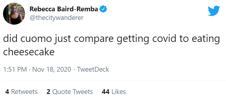This moment of stupidity sparked a swift response. One tweet captured the feeling: “Hey Cuomo? F*** you, I’ve been staying home since March 1st. Now I want cheesecake.” A restaurant seized the moment, tweeting “We’re offering half price cheesecake if you vow not to re-elect Cuomo.”