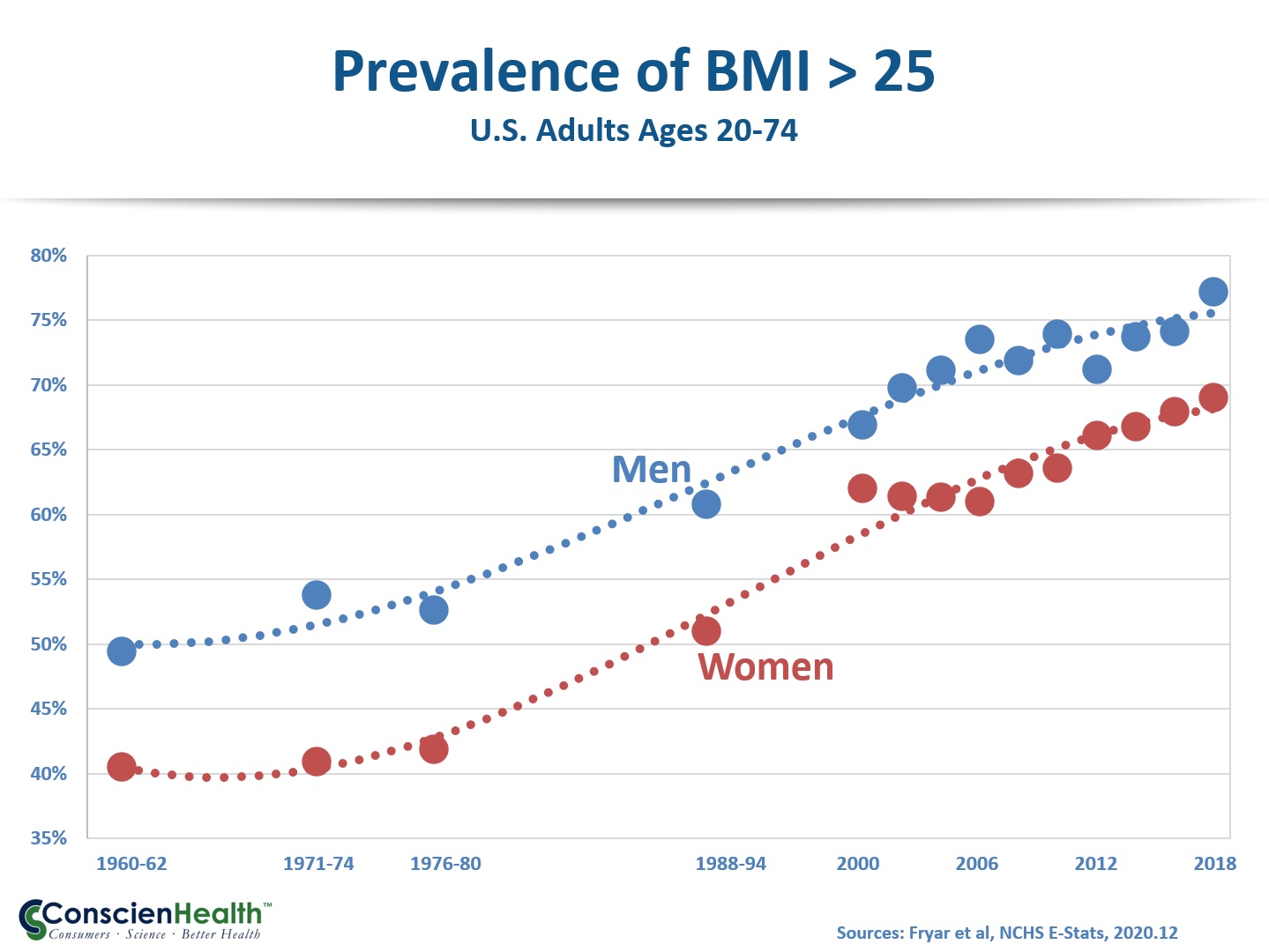 The risk of bad outcomes with COVID-19 rises with BMI. CDC has both overweight (BMI>25) and obesity (BMI>30) on the list of medical conditions that put people at risk and qualify them for a booster shot. Yes, BMI doesn’t precisely define a medical diagnosis of obesity. But it’s close enough for government work, as they say.