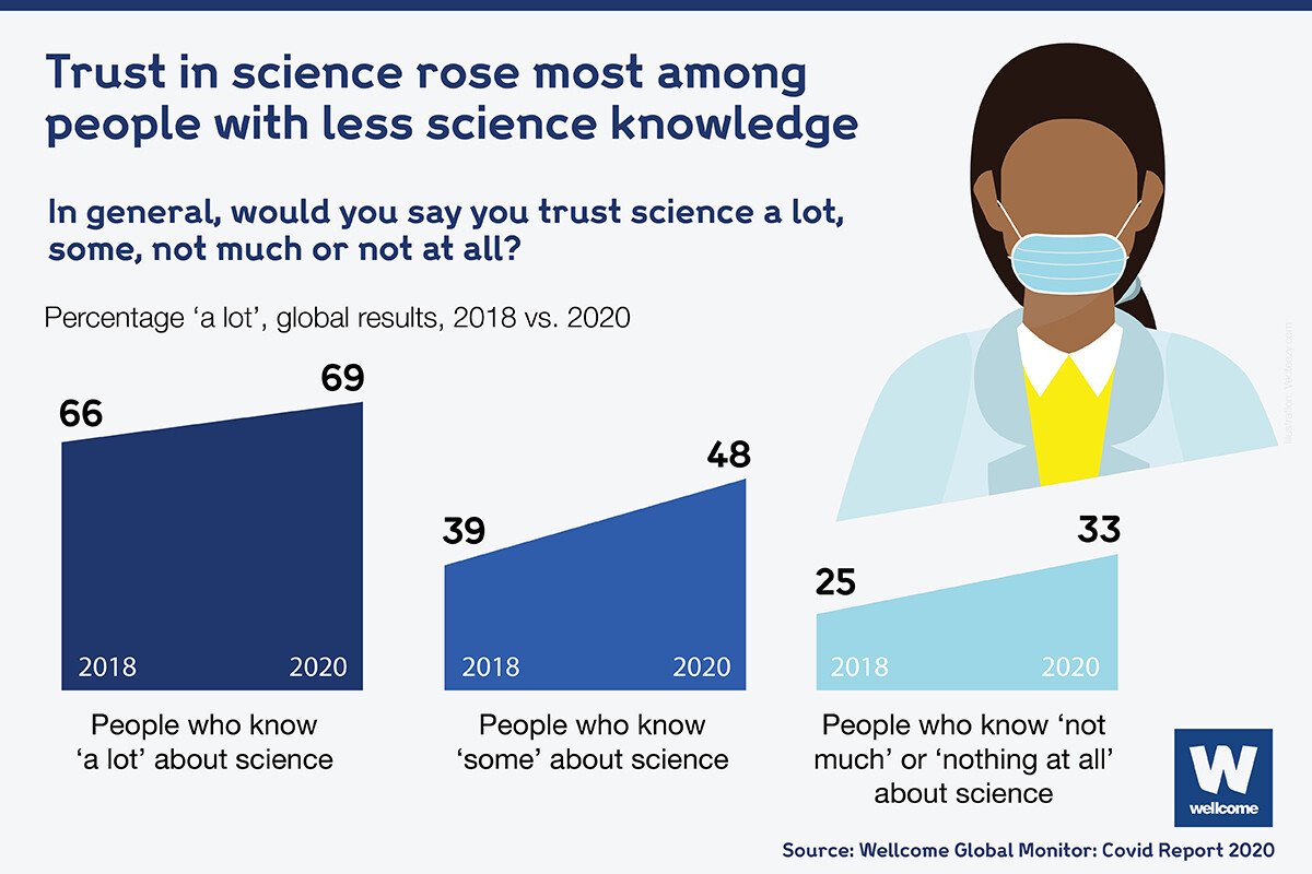 A new report from the Wellcome Foundation tells us that global trust in science grew during the pandemic of COVID-19. From 2018 to 2020 in global survey research, the proportion of people who said they trust science “a lot” jumped from 32 to 41 percent. This rise in trust was greatest among people who said they didn’t know a lot about it. So this trend is not one that reflects the viewpoint of elites – a much broader population is driving it.