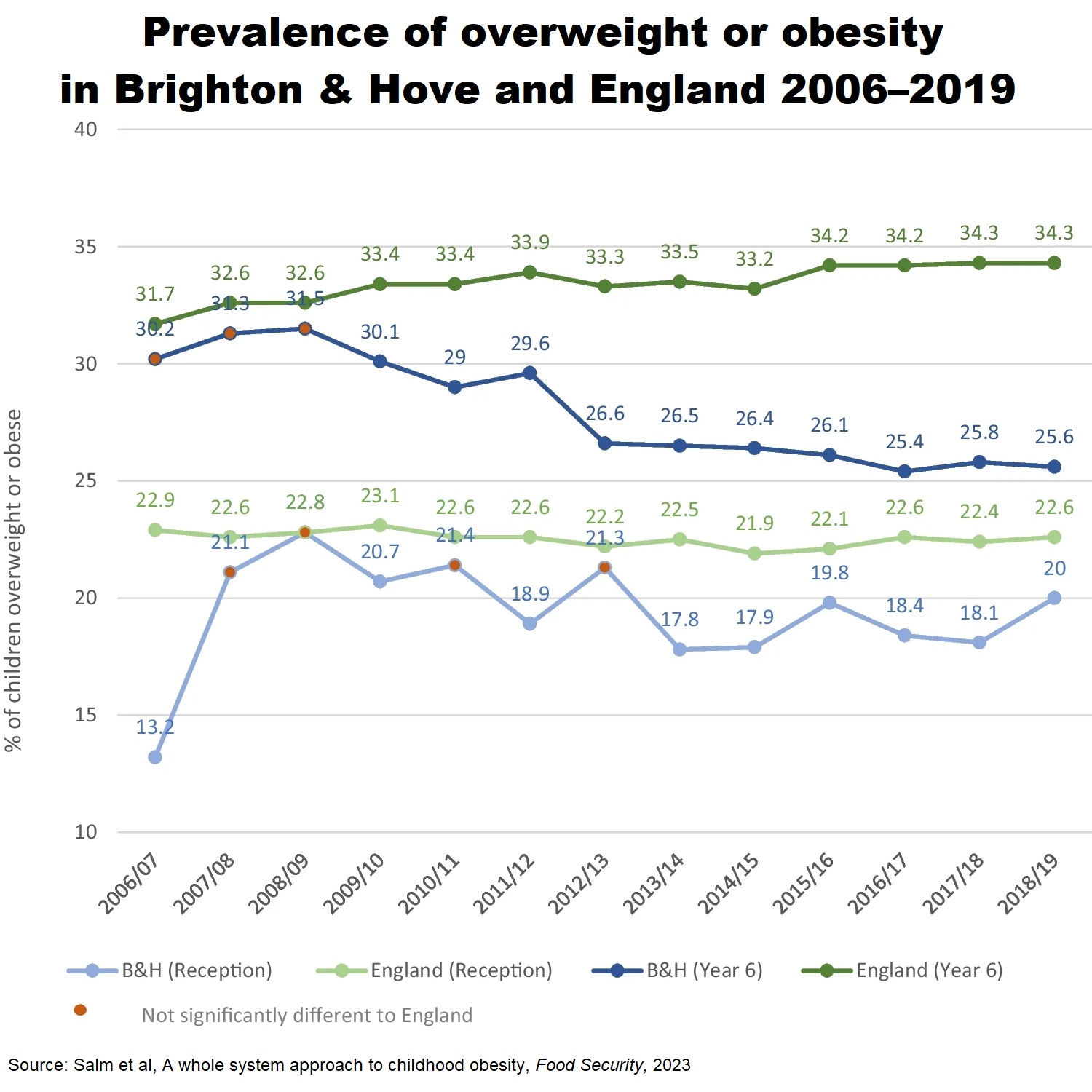 Prevalence of Overweight or Obesity in Brighton and England 2006-2019The case study of Brighton lends credence to Kingdon’s conclusions. Leaders there believe they have found strategies that contribute to a supportive environment for obesity reduction. A substantial part of their efforts have focused upon food poverty. The results are encouraging, as Leah Salm and colleagues document with a new paper in Food Security. Yet they are quick to say that definitive evidence is still lacking: