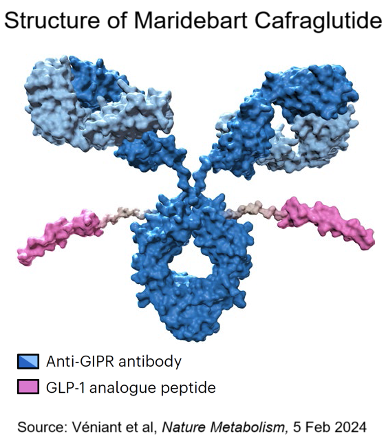 Structure of Maridebart CafraglutideFor Amgen, this is more than just a hypothetical. The company is developing a unique dual agonist/antagonist called maridebart cafraglutide. It acts on both GIP (glucose-dependent insulinotropic polypeptide) and GLP-1 receptors. However, this is not the only way in which it is different from existing GLP-1 medicines for obesity.